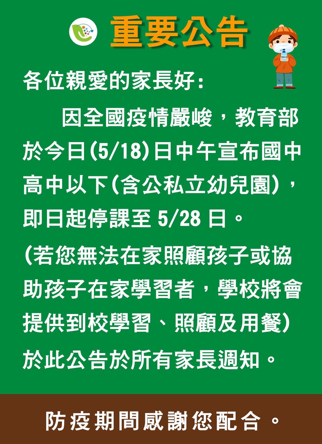 若您無法在家照顧孩子,學校將會提供到校學習、照顧及用餐。